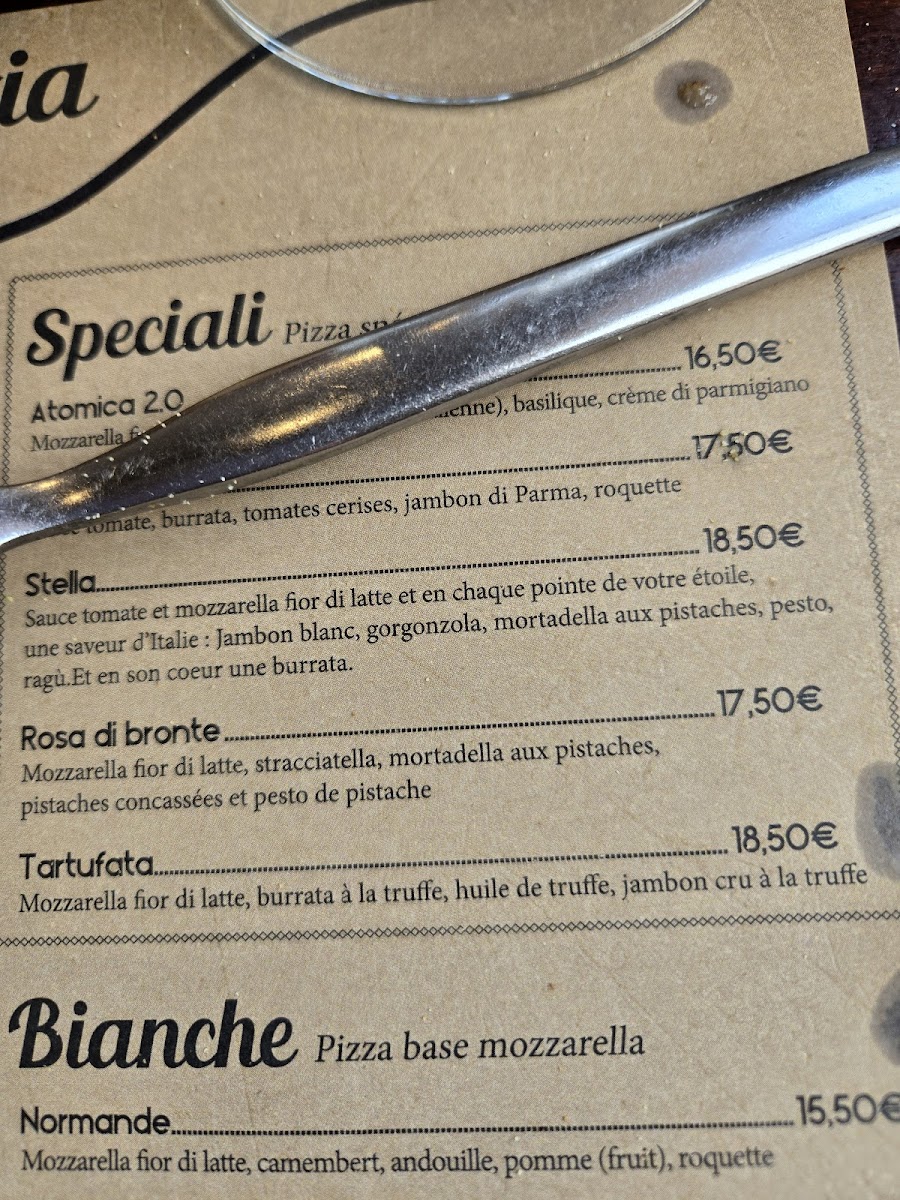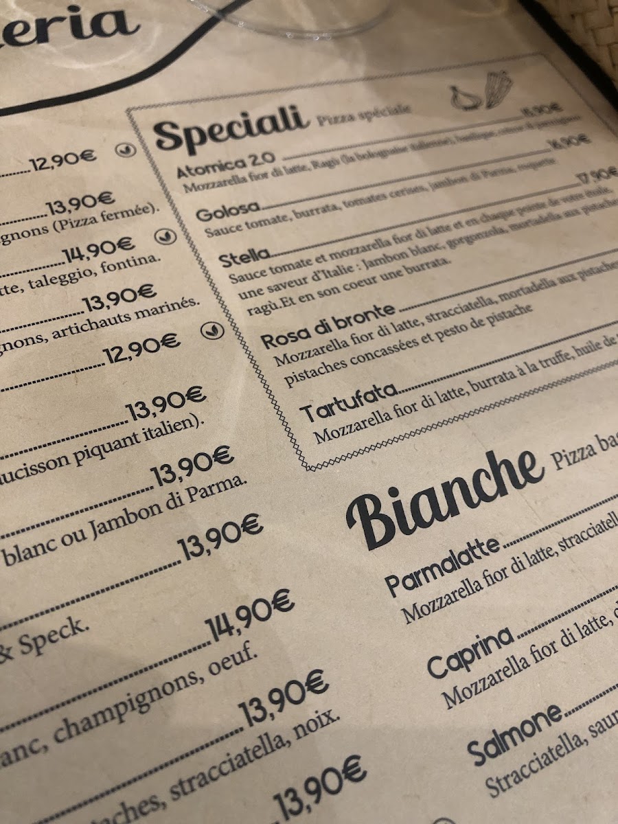 Au choix : Bianca o Rossa. Gorgonzola, mozzarella fior di latte, taleggio, fontina.